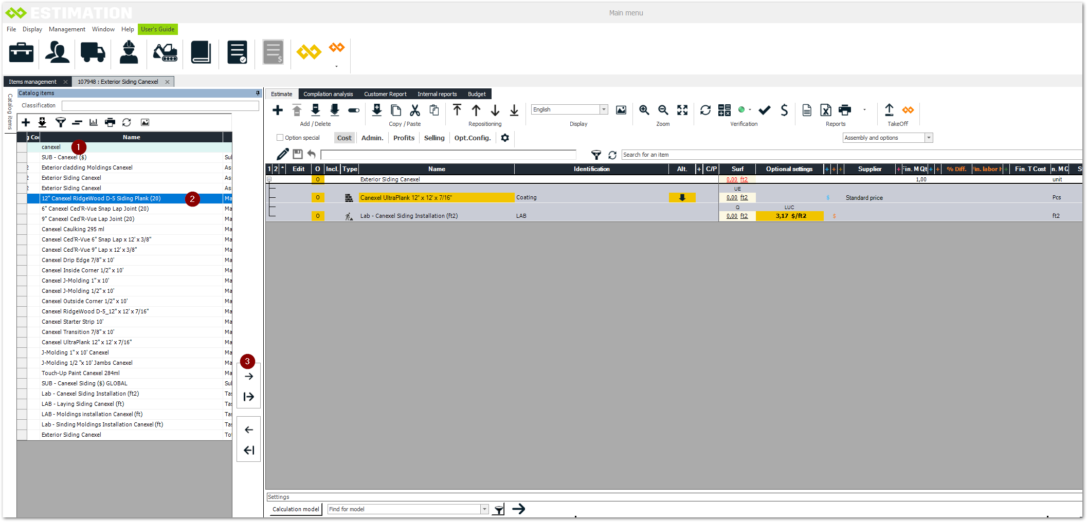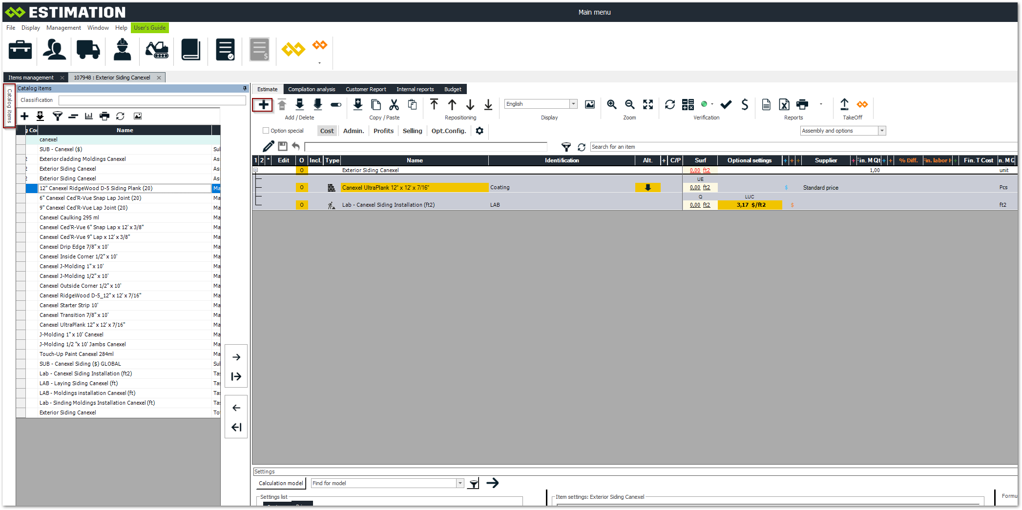 Once the calculation grid is open, you will see the Catalog Items panel on the left. If it is not open, then click on the + or on "Catalog Items" to open it.