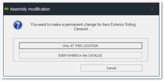 You will then see this window above appear, which asks if you want to change your assembly globally or locally. When building your assemblies, choose "Anywhere in the Catalog" all the time. The local change will be useful if you are inserting your assembly into a template or other assembly and want it to have a special feature right there.