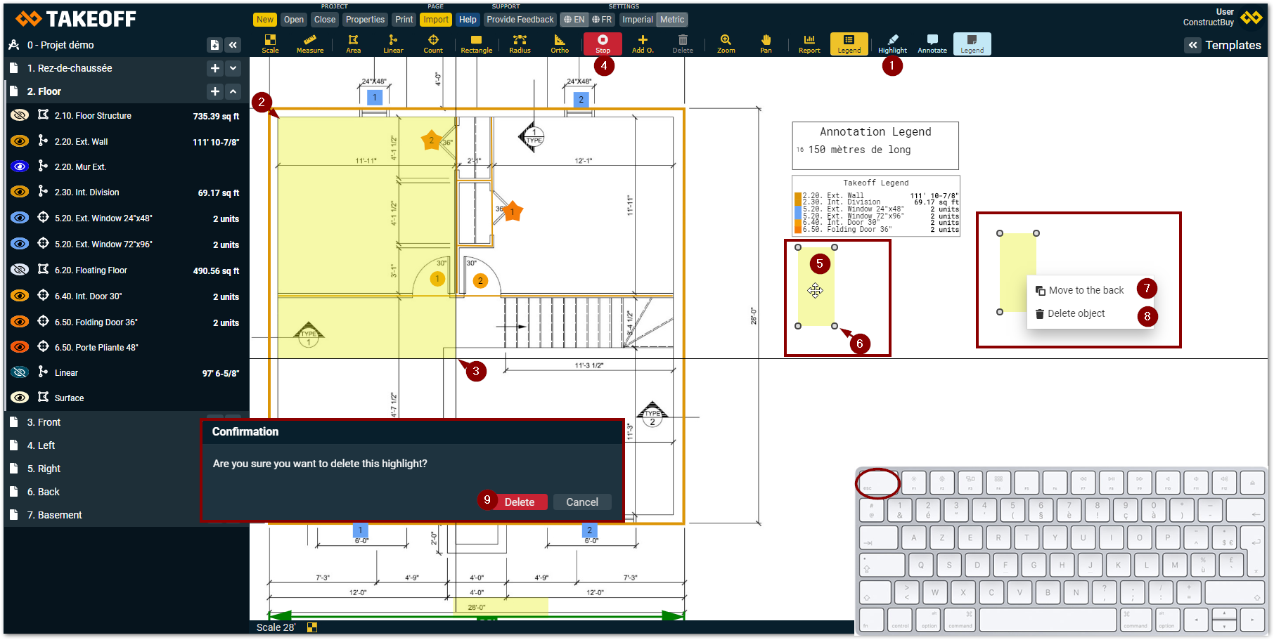 Make sure that you can always see your takeoffs in the highlighted zones of your plan by making a right click on your highlighted zone and by choosing “Move to the back”