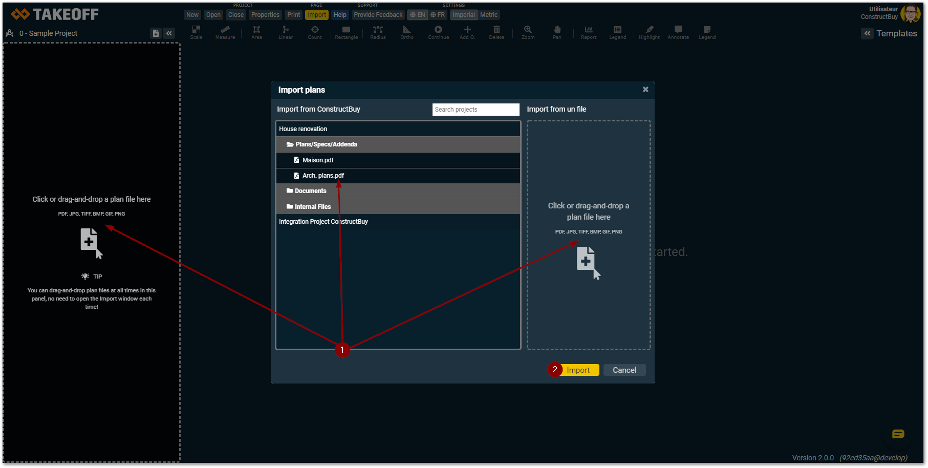 • Import plans directly from a project on ConstructBuy by clicking on the name of the name of the project, on the document and on the file you wish to import into your TAKEOFF project