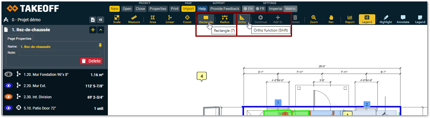 If you are on TAKEOFF and you want to know the keyboard shortcut of a specific action, hover your mouse on top of the tool you want the shortcut to, the keyboard shortcut will appear in parenthesis under the mouse.